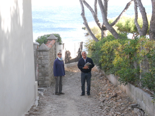 So.....after the Chez Bruno day, we spent the next rediscovering Cassis, one of my favorite places. Rita and Joel had offered to take us there by boat, but the Mistral had other ideas. In all the travels to France, including 6 weeks in Montpelier many years ago and time spent in Provence, we finally had the experience of this legendary wind from the North that blows with ferocious fury while the sun shines crisp and bright. And it's a cold wind! So that boat ride and any idea of any boat ride to the Calanques (fiord-like structures that rise from the sea) were out of the question. And the Route des Cretes, over the mountain from La Ciotat to Cassis, closes when there is sufficient wind. It was closed! So we drove instead to the city, saw the Calanques from above, climbed down a path to the sea and then walked around the city. We usually stop at Nino's for a drink, but it was closed too. My DH's family nickname is Nino, so we wanted to pay homage to him!