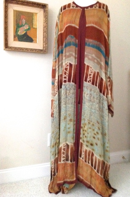 She brought me the most amazing dress to cut up and use for a variety of purposes in my creations. It's a beautiful rayon print with the look of hand painting. It is many sizes too big for her now (YAY!!!) In return, I will make her a felt-tipped scarf. The fabric is voluminous, so I'll be able to get several such scarves out of it and still have plenty left for use in Upcycle Scarves or even knitting with fabric. Can't wait to get my hands "dirty!" Thanks so much, BJ! It's a shame to cut it up, but I promise beautiful scarves and other uses for the material.